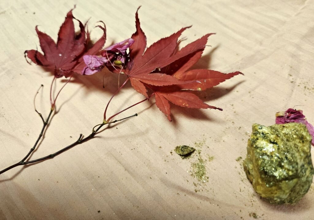 Then I took the mica, my grandmother’s amethyst, leaves and petals and I placed them like decorations at work, and I saw them and held them to help me stay with that peace.
