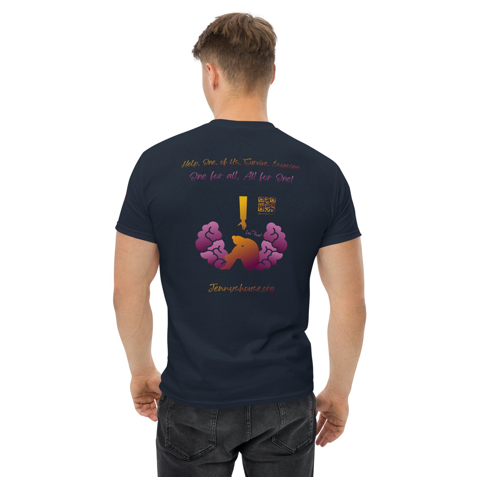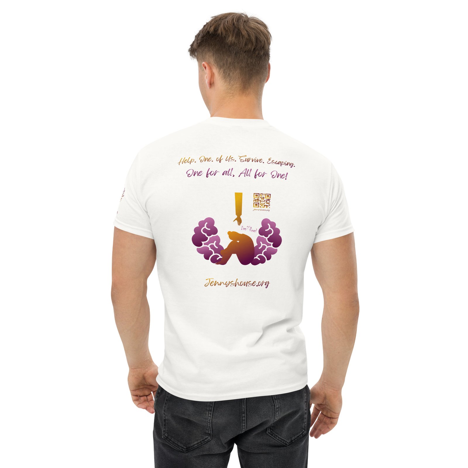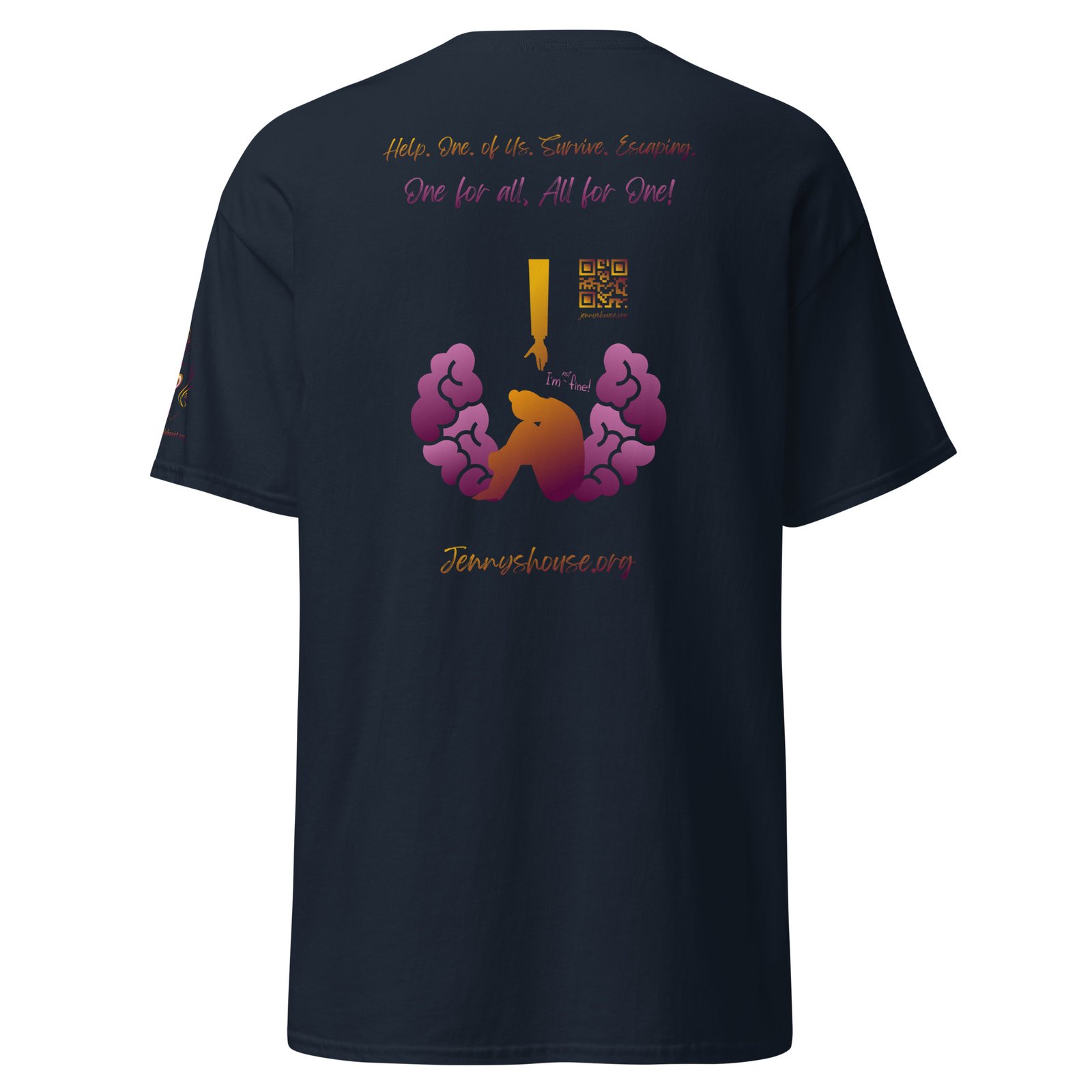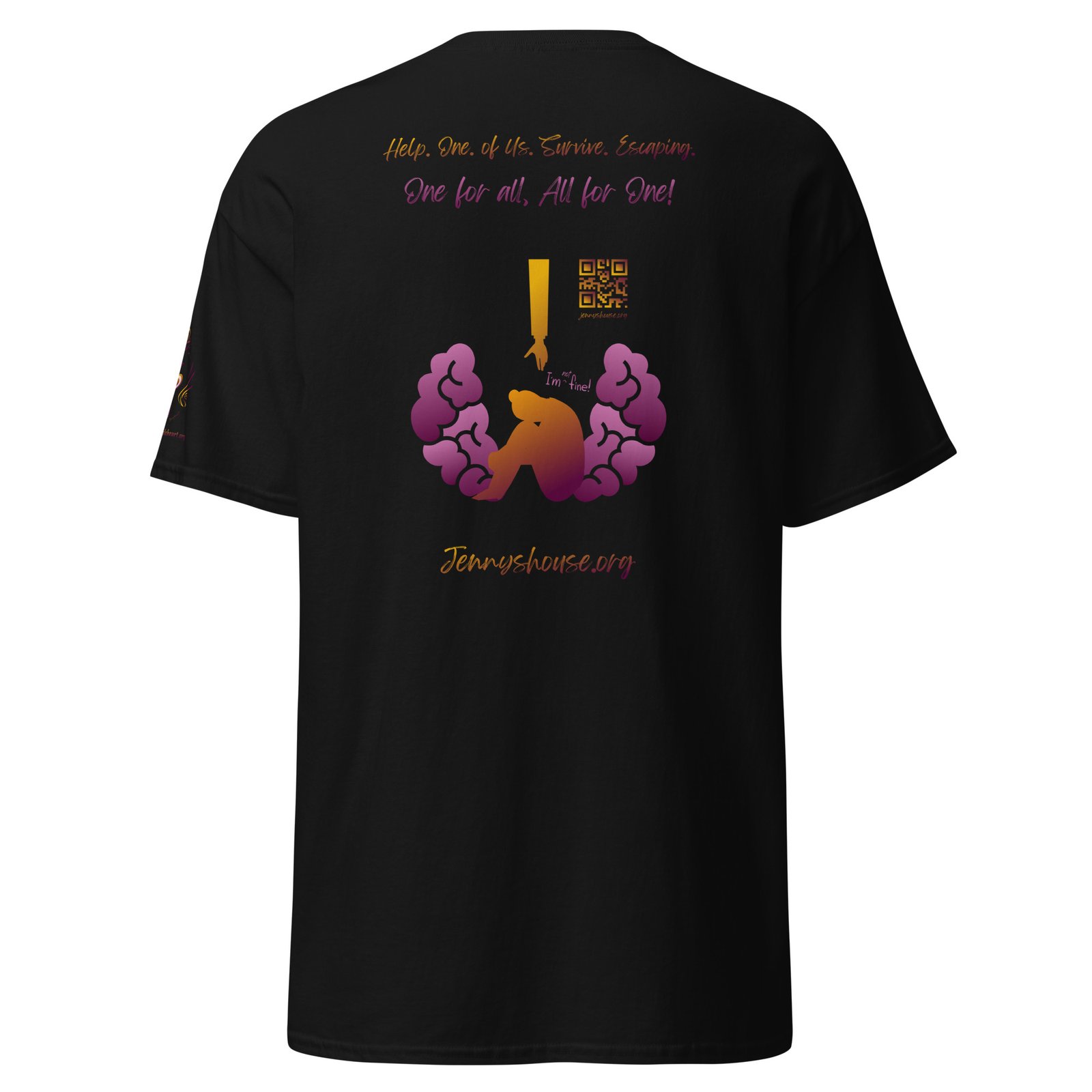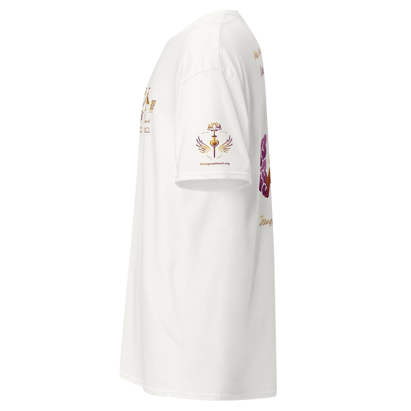 Jenny’s HOUSE heart side print dark gradient, all for one on back and Thrive Purple Heart Crest on Sleeve ✦ Safe for work and school