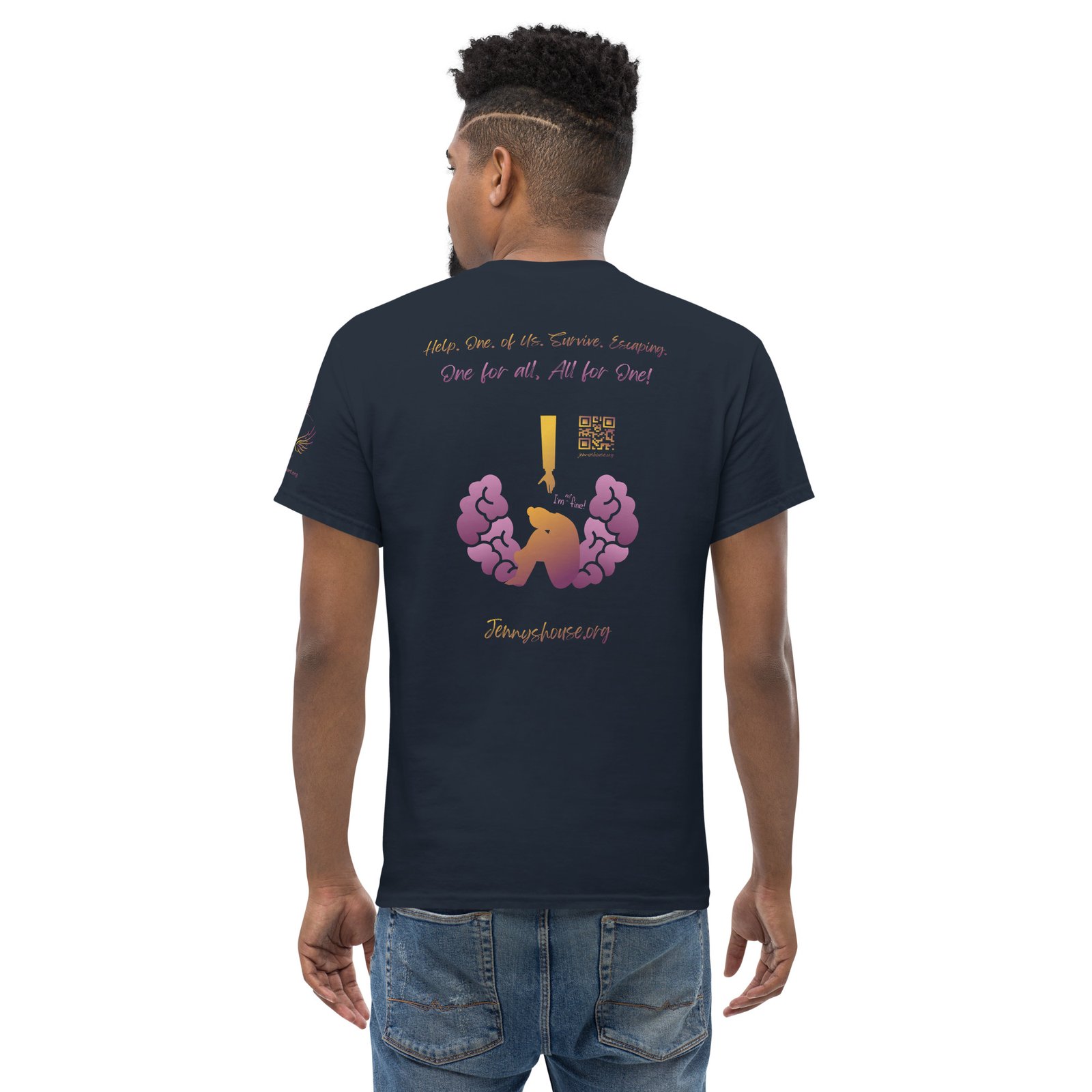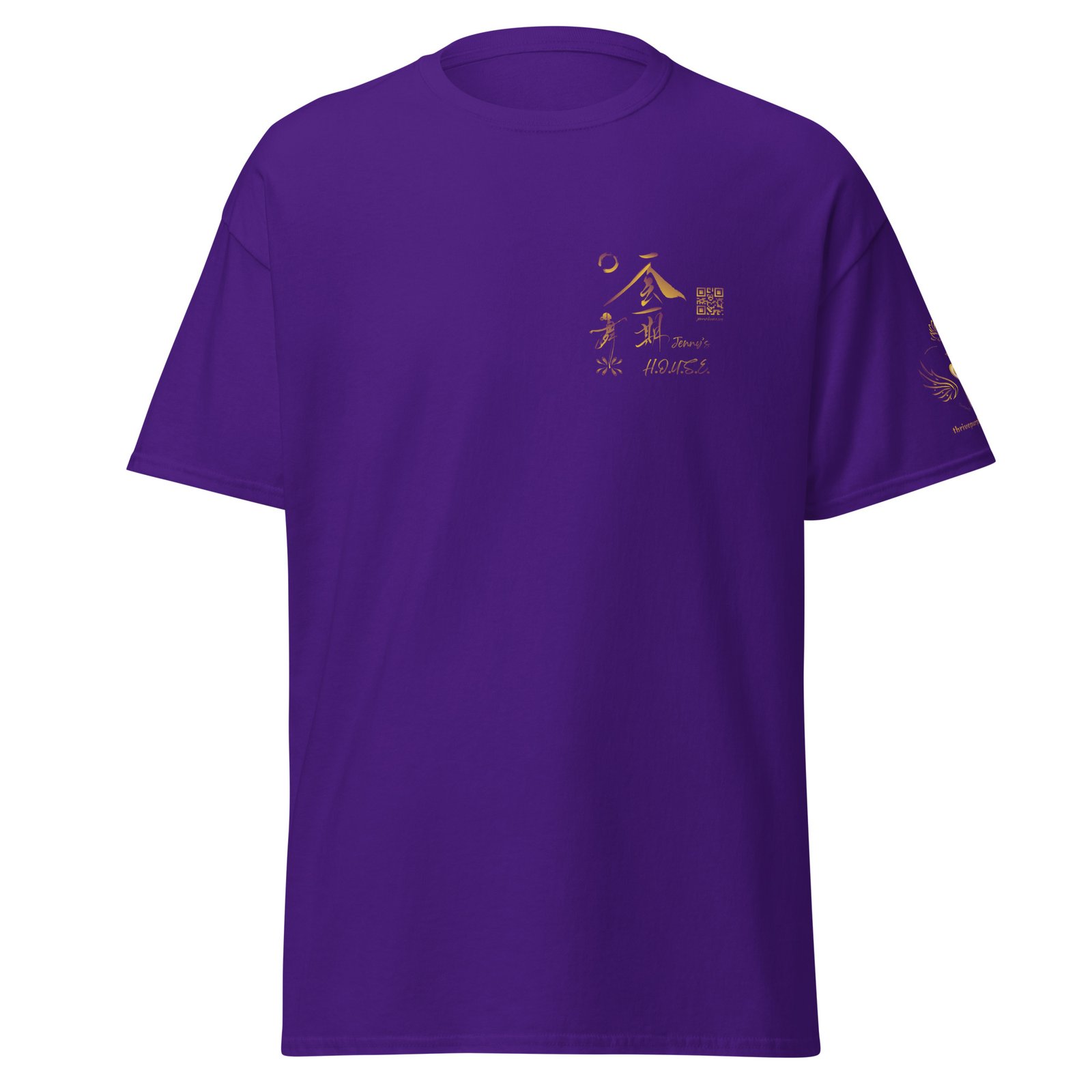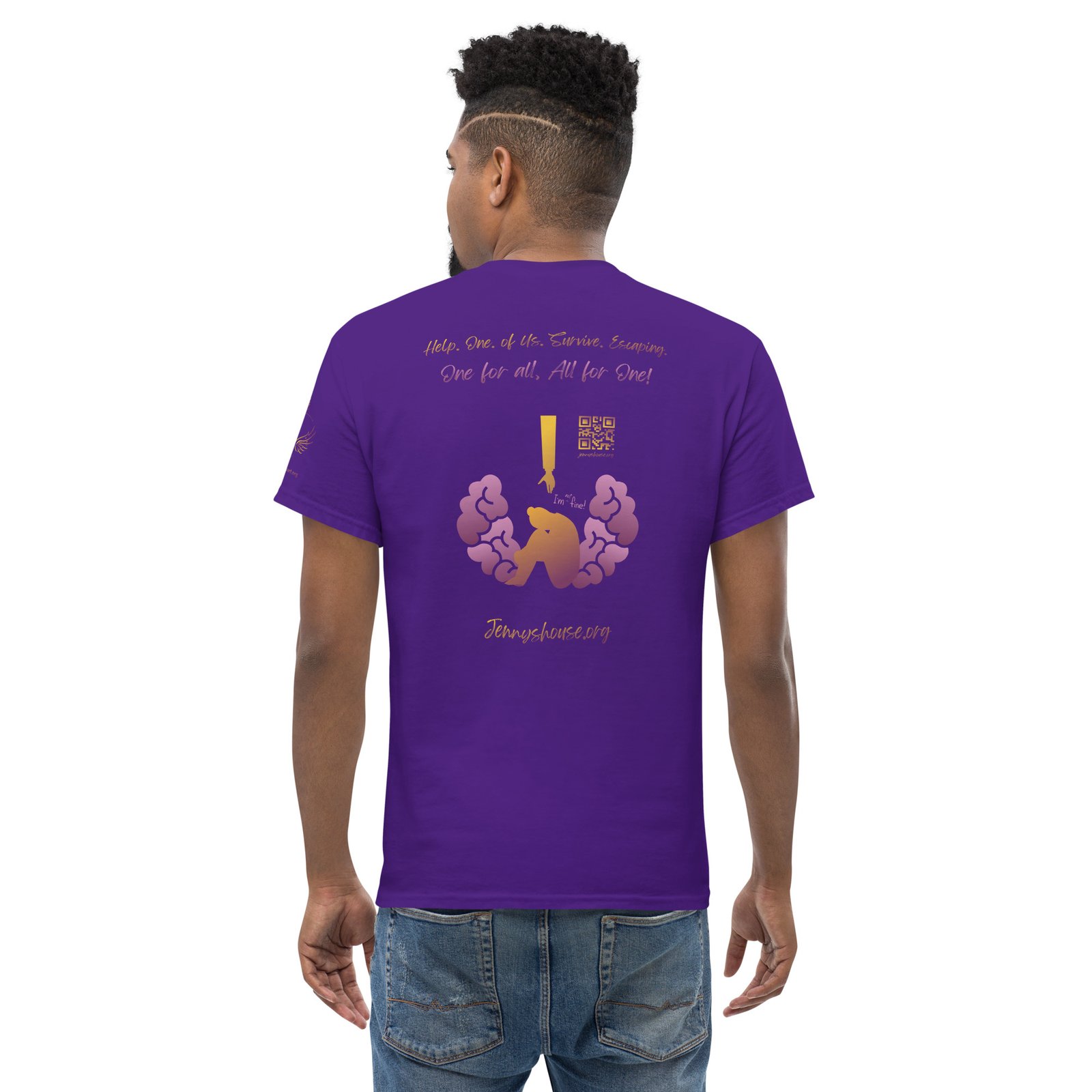 Jenny’s HOUSE heart side print dark gradient, all for one on back and Thrive Purple Heart Crest on Sleeve ✦ Safe for work and school