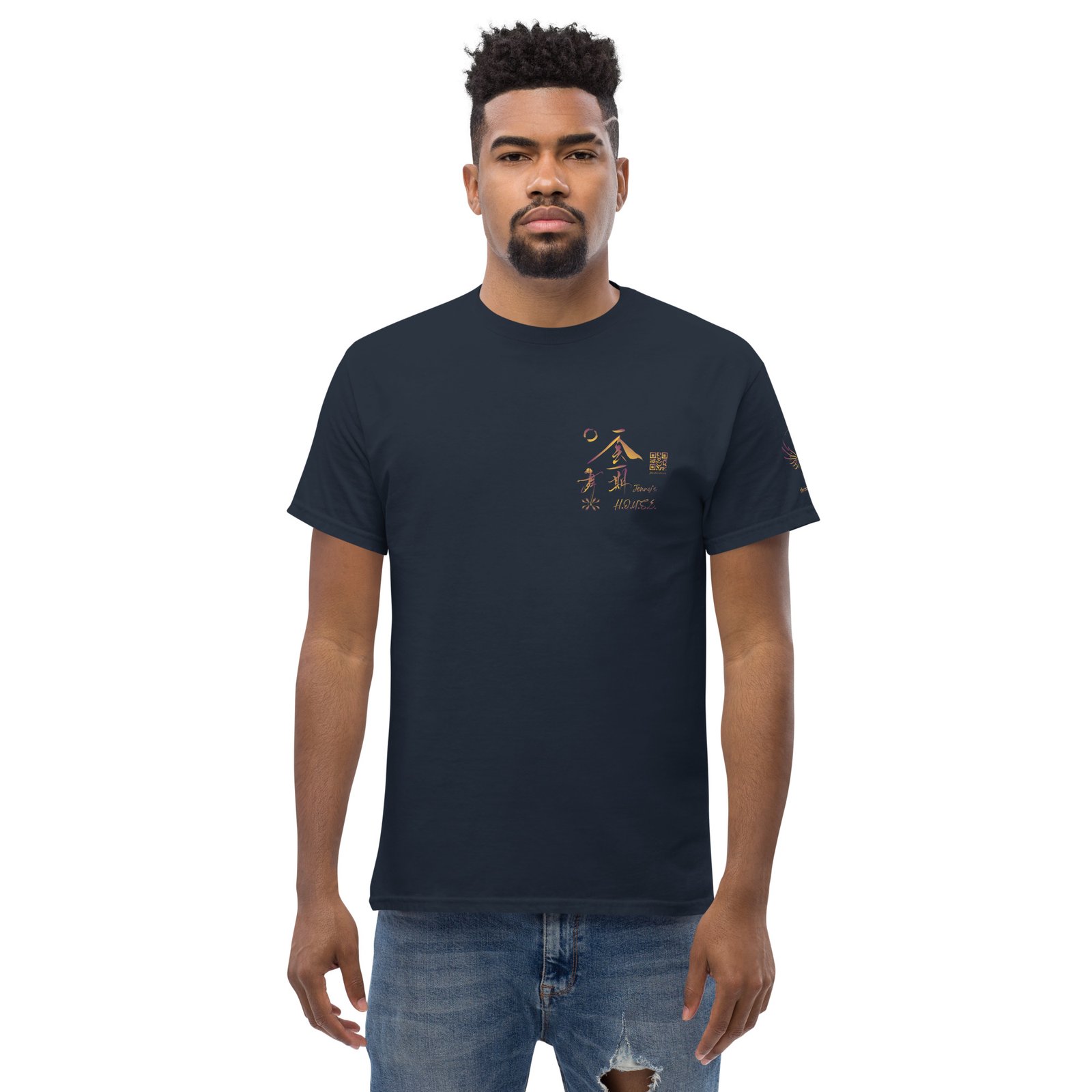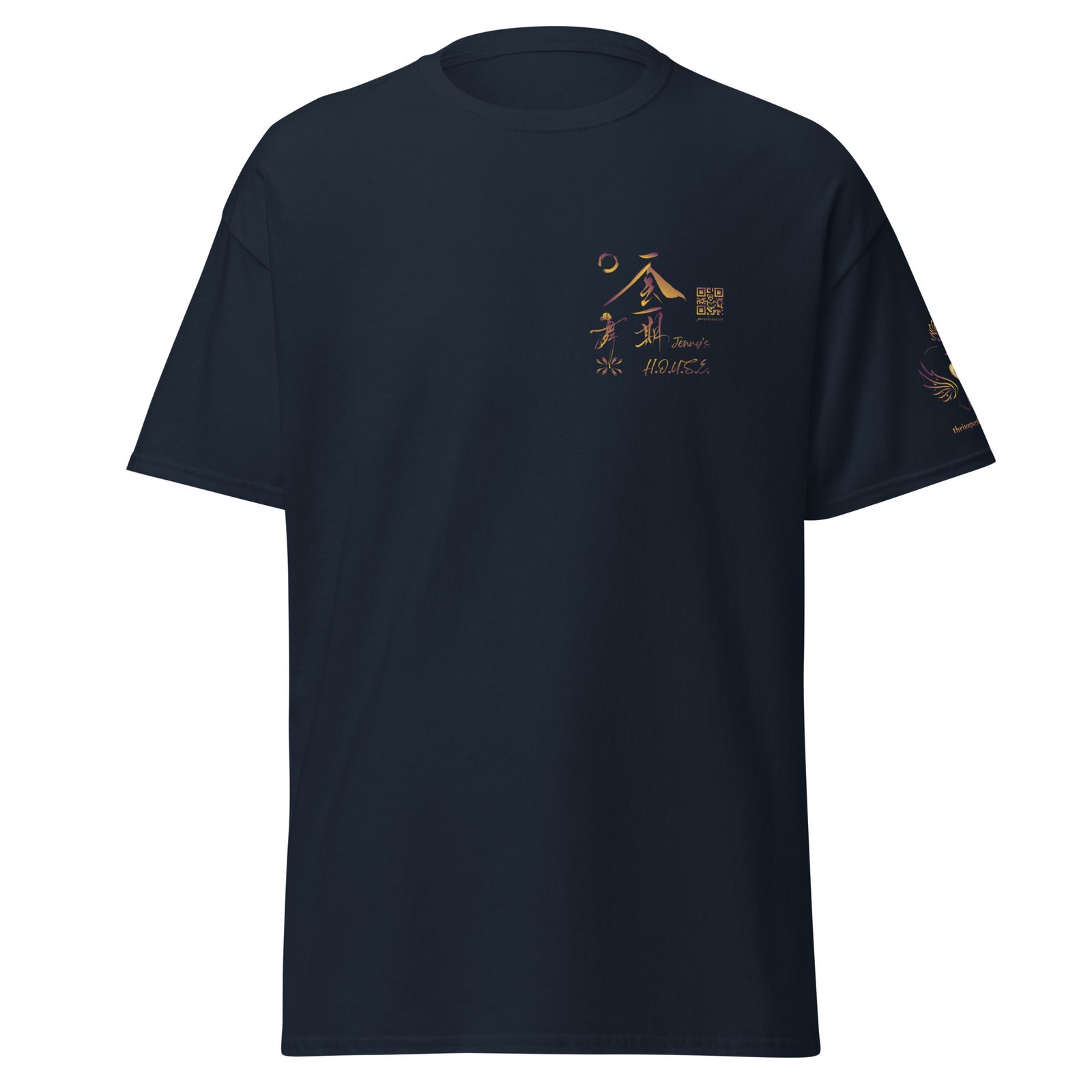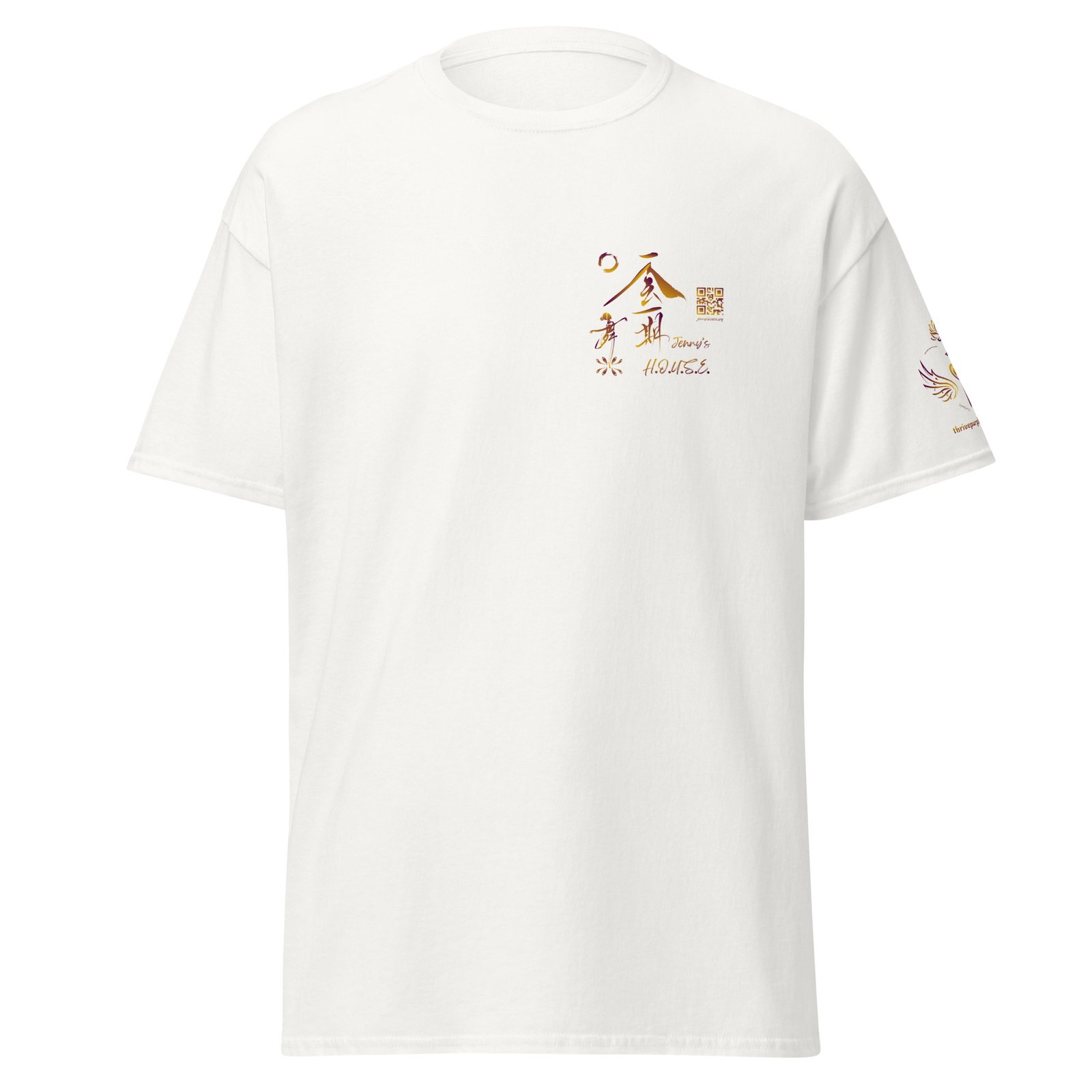 Jenny’s HOUSE heart side print dark gradient, all for one on back and Thrive Purple Heart Crest on Sleeve ✦ Safe for work and school